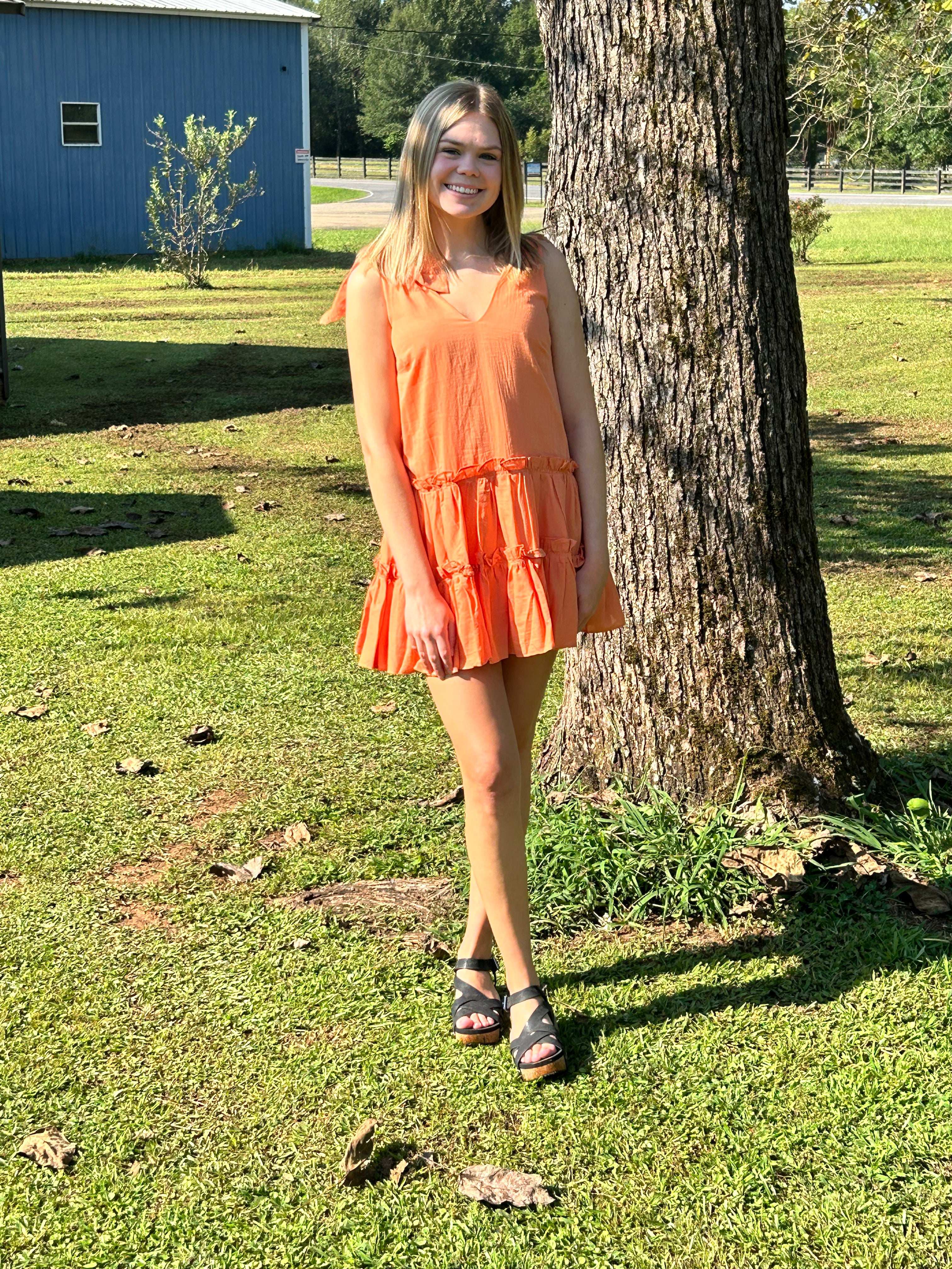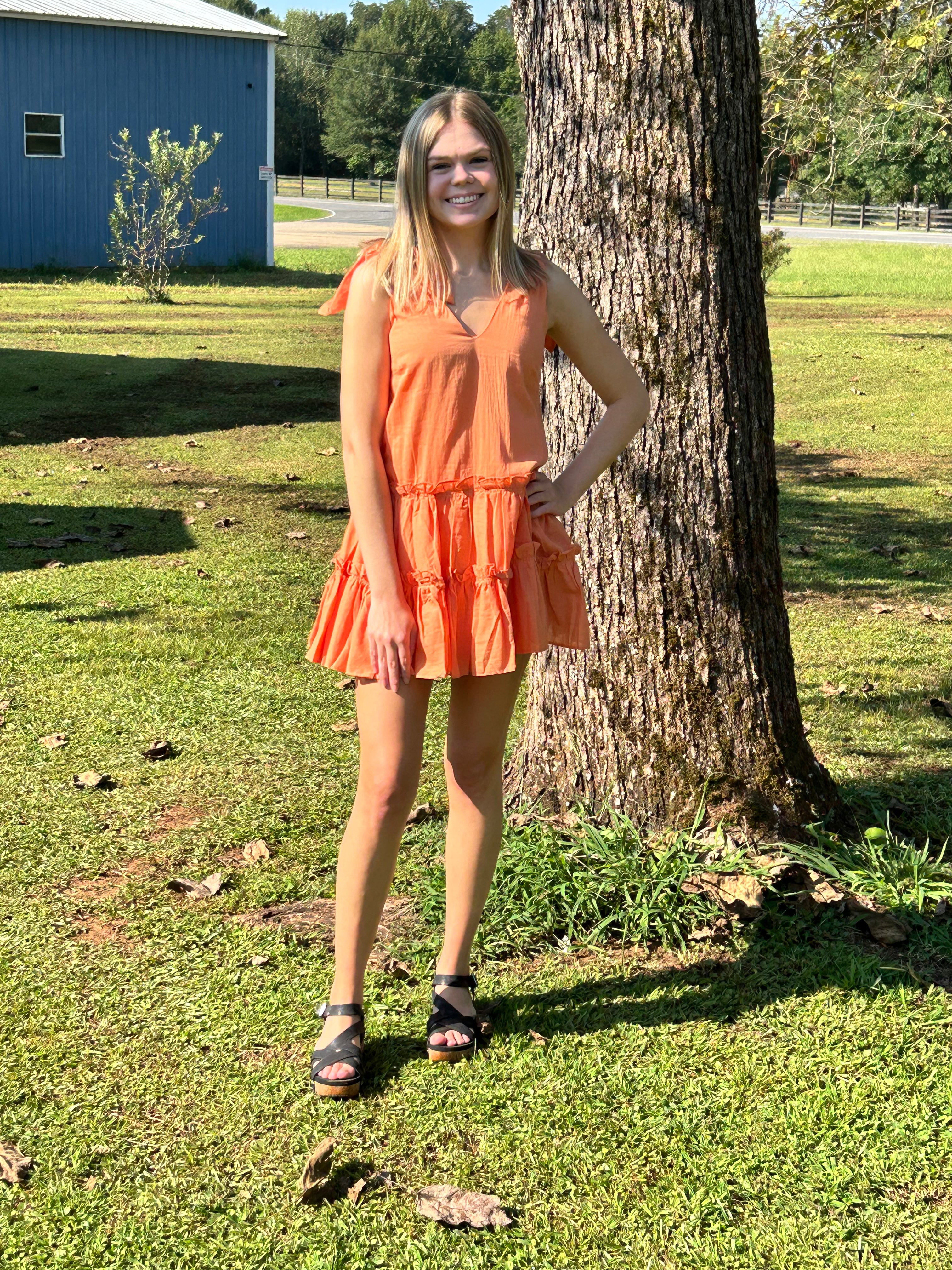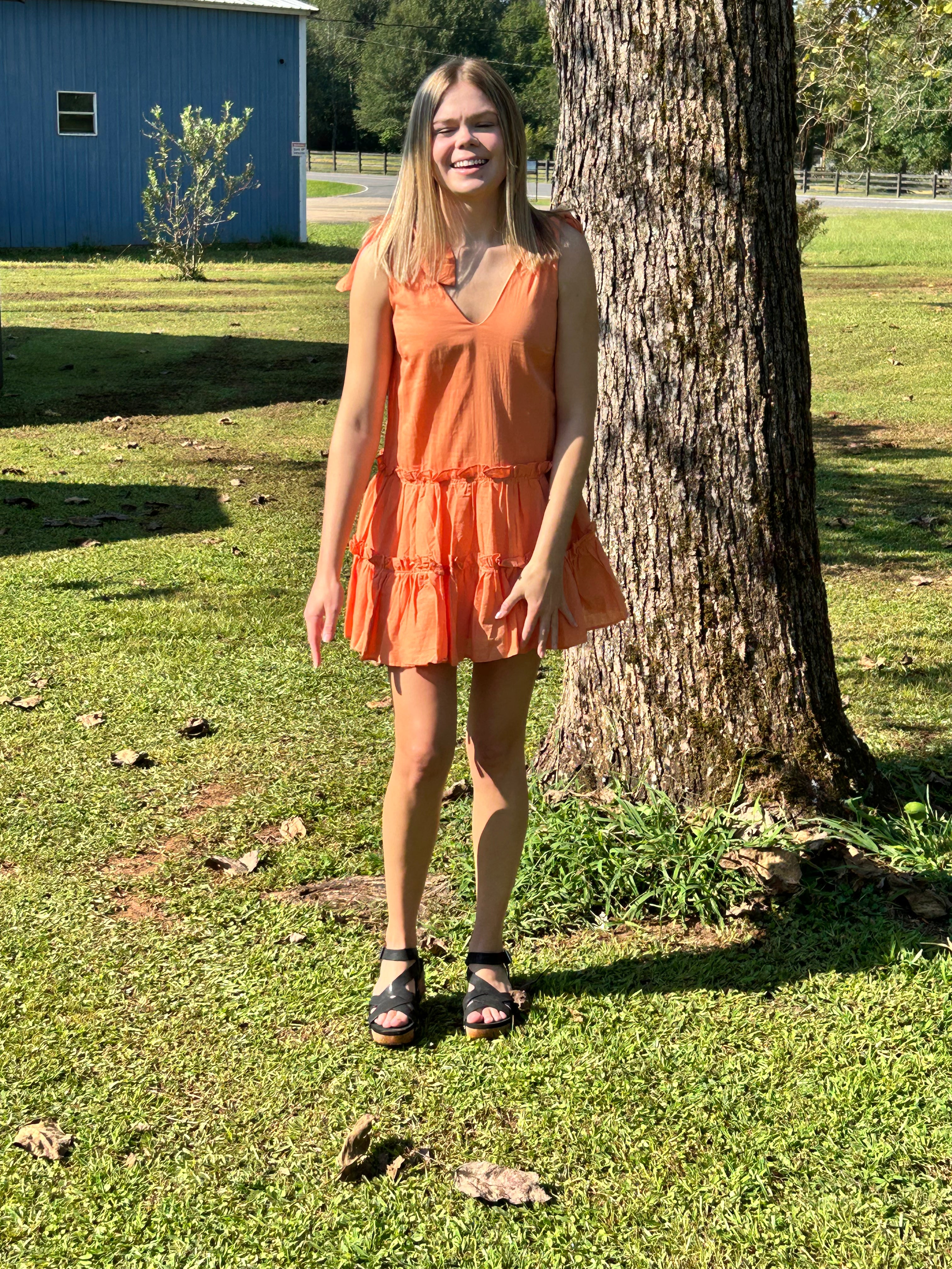 Such an cutie! This orange sleeveless v-neck mini dress is fun and flirty with a ruffled bottom and flared effect. Oh and it has the most adorable tie sleeves! Another great game day outfit for your collection.